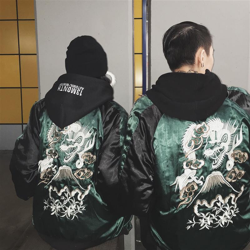韓國chic秋冬款寬松重工刺繡情侶款拼色夾棉加厚棒球服外套女