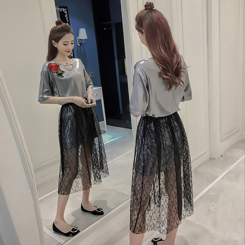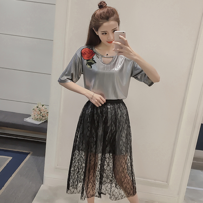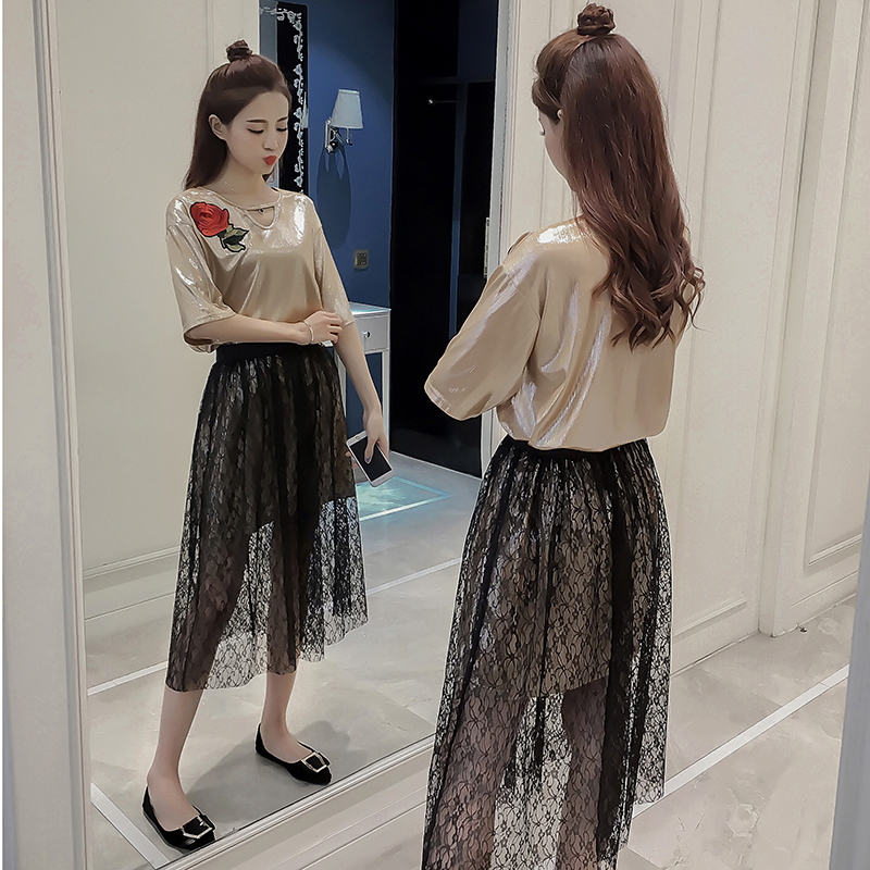 夏季新款女裝韓版時尚刺繡上衣兩件套休閑顯瘦蕾絲半身裙套裝