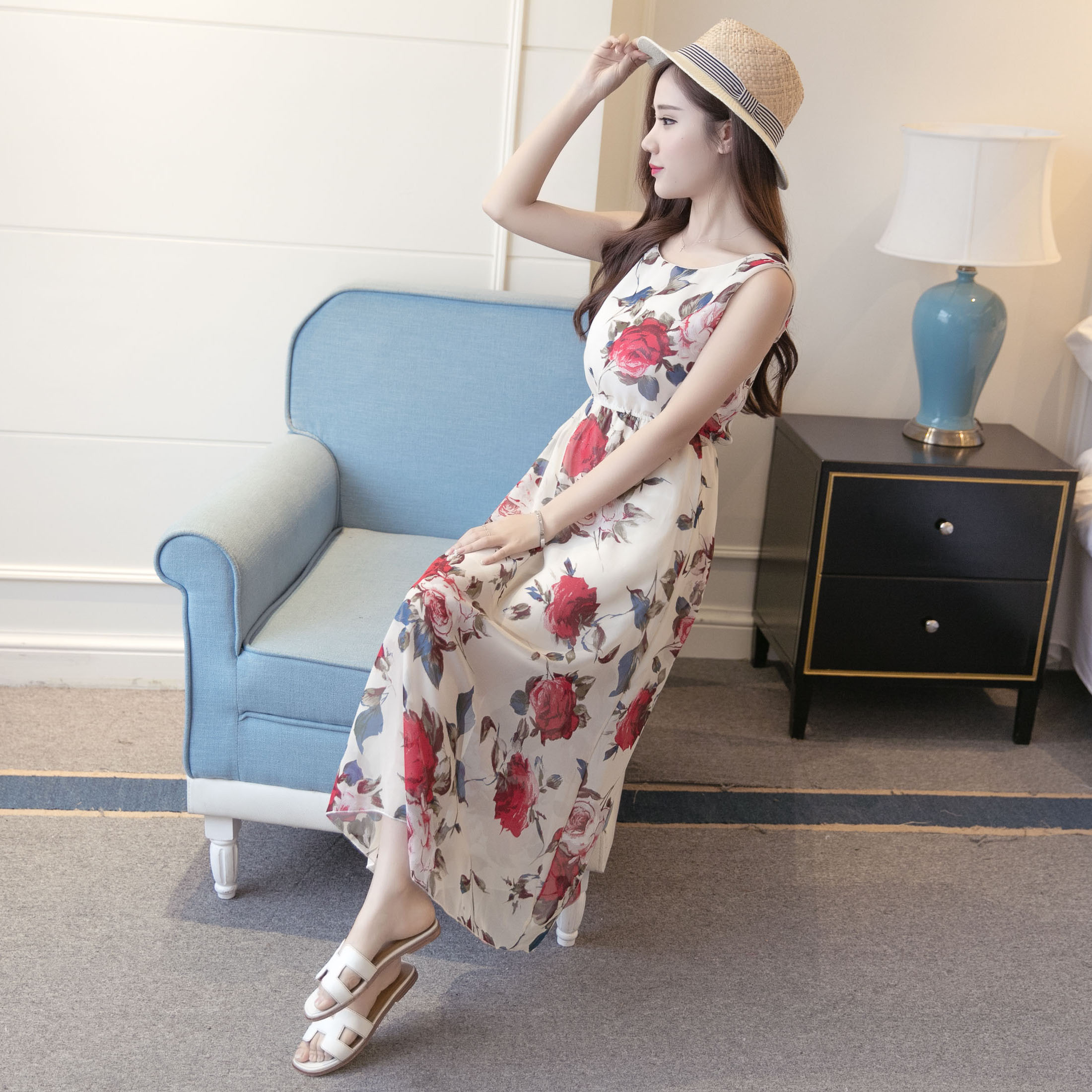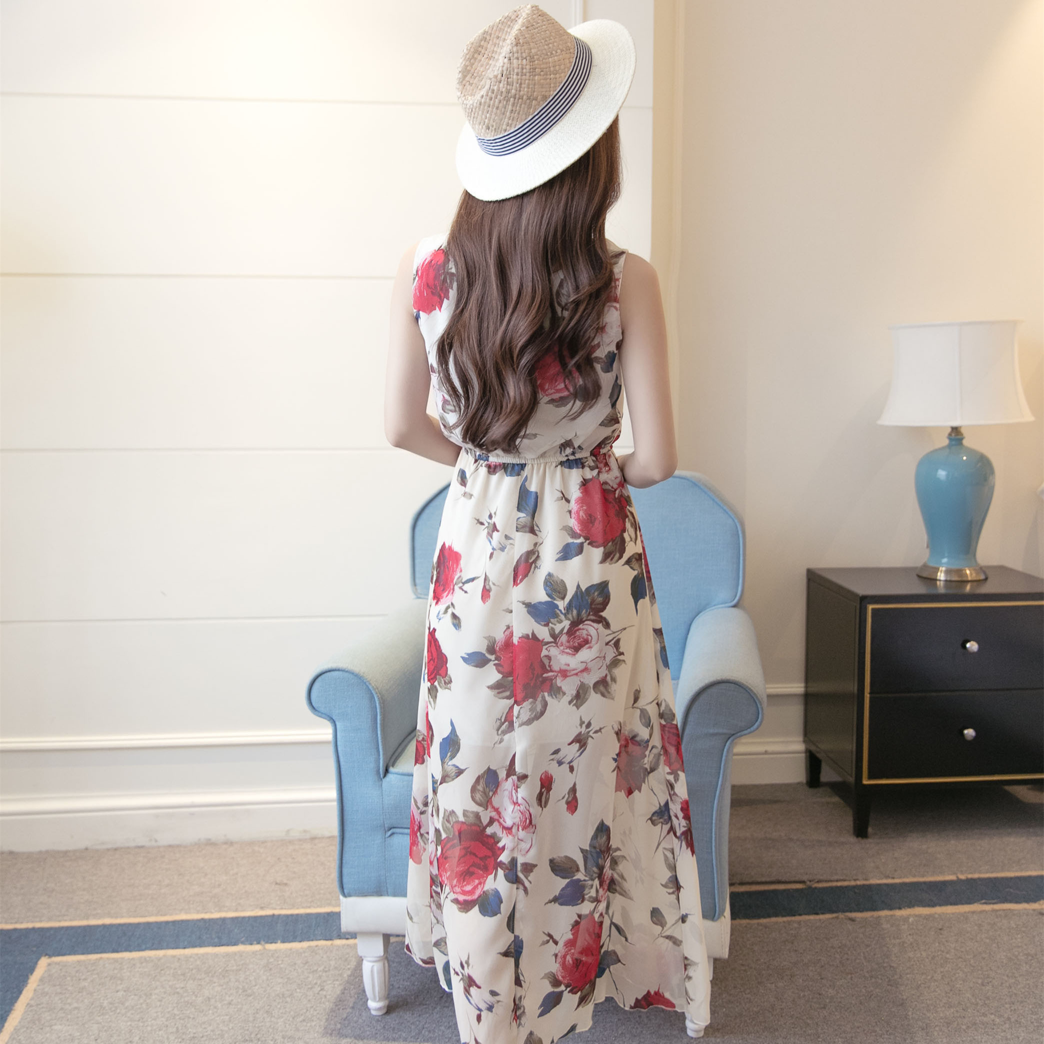 / 夏季新款女裝波西米亞度假沙灘裙無袖印花碎花背心裙子雪紡連衣裙