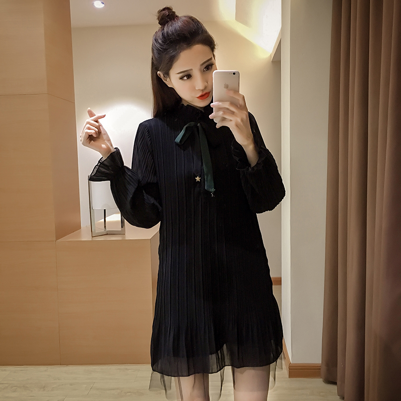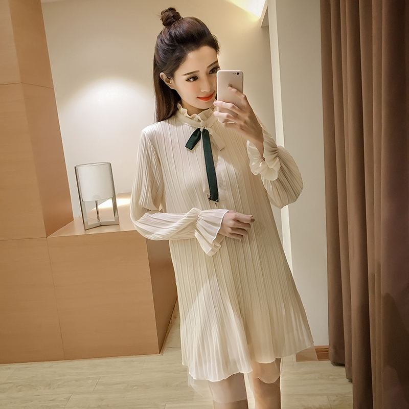 / 春裝新款女裝韓版喇叭袖打底裙中長款顯瘦長袖百褶雪紡連衣裙
