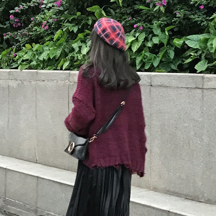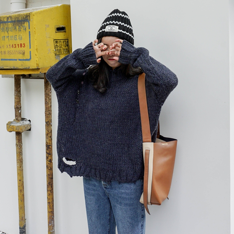 韓國chic秋冬款寬松顯瘦不規則半高領破洞套頭粗針毛線毛衣女