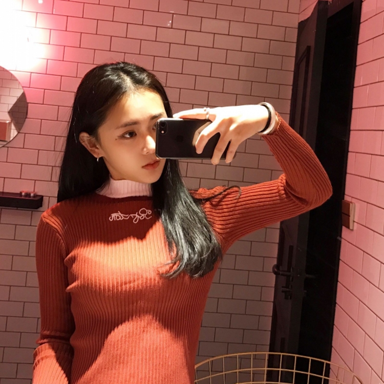 ANH韓國chic秋冬拼色半高領修身刺繡字母套頭螺紋針織衫打底衫女