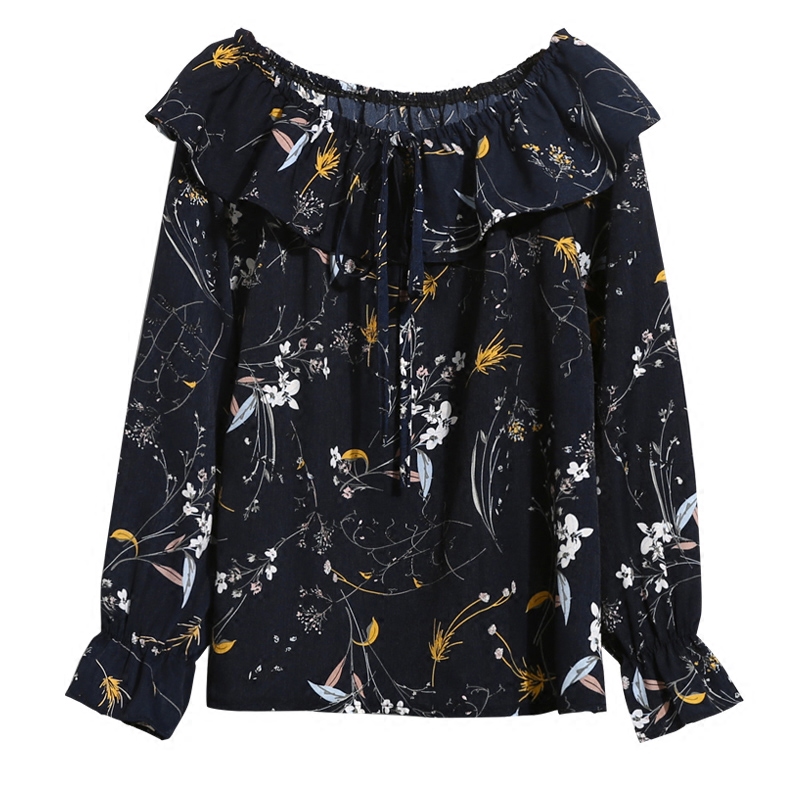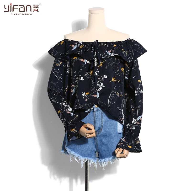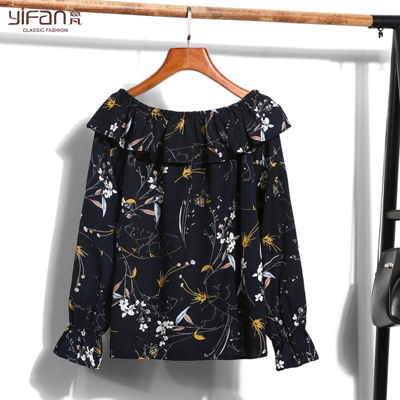 / 春夏季新款韓版復古一字領露肩寬松荷葉邊喇叭袖碎花雪紡衫女上衣